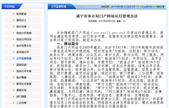 (一)加强组织领导,完善机制。咸宁市审计局党组高度重视政府信息公开工作,年初召开专题会议细化分解目标,明确责任部门和责任人,并提出相关要求。分管领导经常听取网站建设、审计信息发布等情况汇报,及时协调解决了网站维护经费、信息更新等方面的困难和问题,并督促相关责任部门抓好落实。制定了《咸宁市审计局门户网站运行管理办法》,以正式文件的形式进一步明确了栏目更新要求、信息发布流程等,全面保障政府信息公开工作的有力推进。