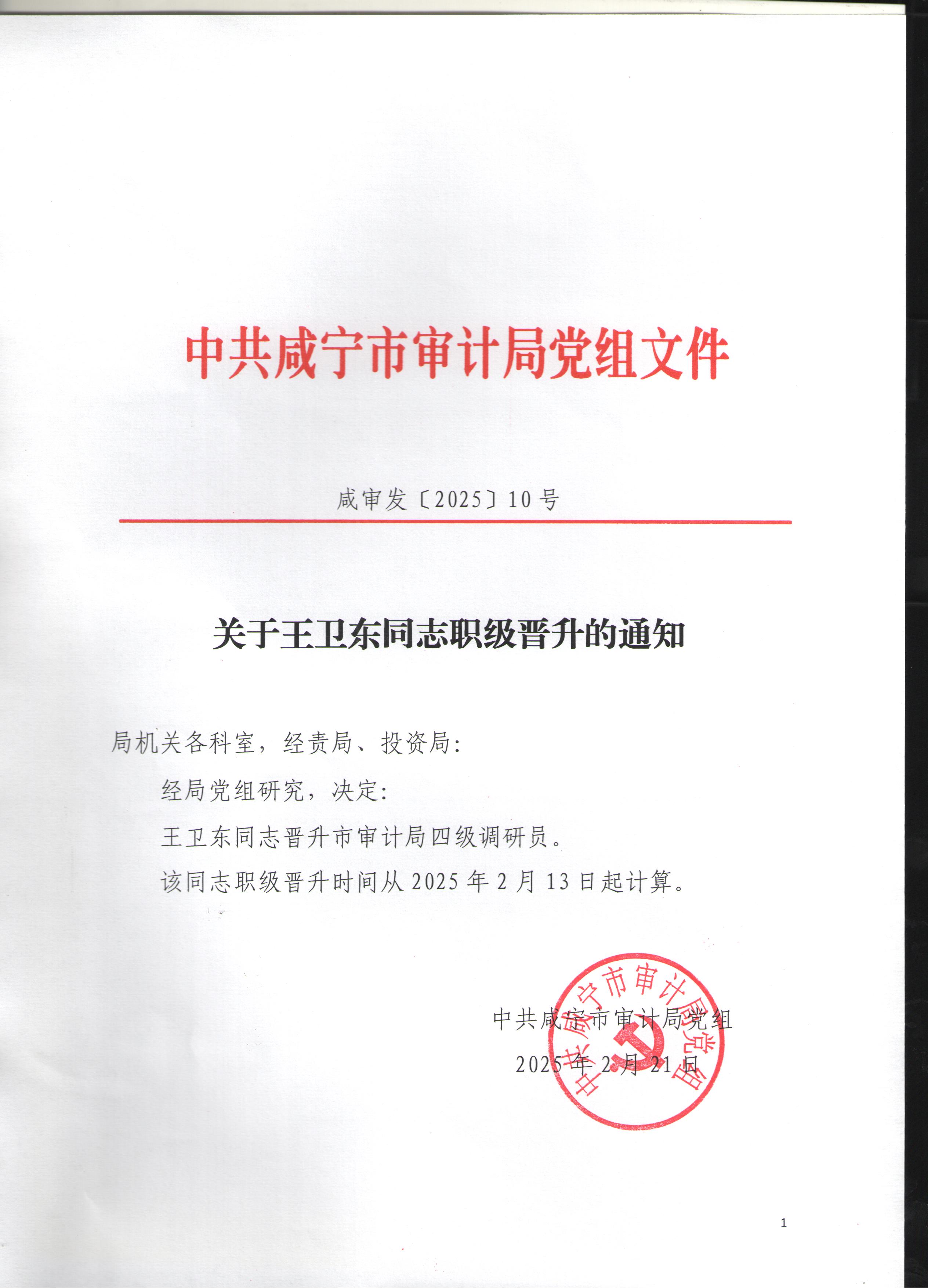 名 称: 关于王卫东同志职级晋升的通知 发布日期: 2025年02月24日