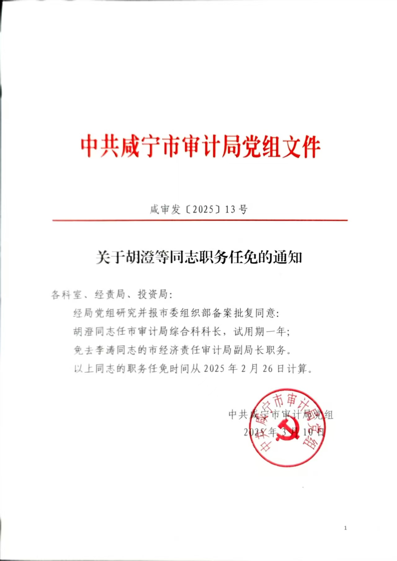 名 称: 关于胡澄等同志职务任免的通知 发布日期: 2025年03月14日