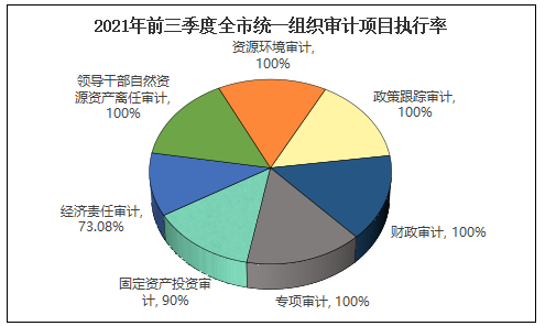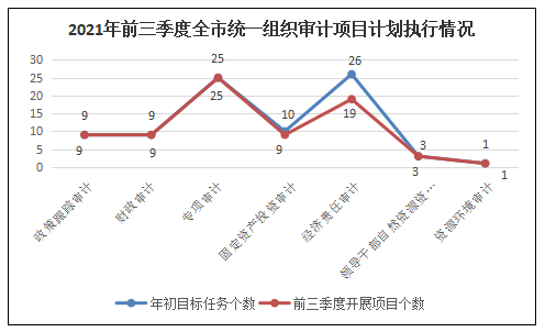 2021年我局按照《咸宁市2021年度全市统一组织审计项目计划》安排,拟定审计项目83个,其中政策跟踪审计项目9个,财政审计项目9个,专项审计项目25个,投资审计项目10个,经济责任审计项目26个,领导干部自然资源资产离任审计项目3个,资源环境审计1个。前三季度审计项目执行情况如下:
