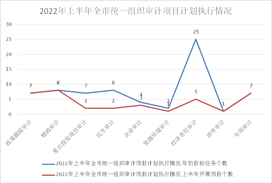 2022年,我局制定了《咸宁市2022年度统一组织审计项目计划》,拟定全年审计项目69个,其中政策跟踪审计7个,财政审计8个,重点投资项目审计7个,民生审计8个,企业审计4个,资源环境审计2个,经济责任审计25个,涉外审计1个,专项审计7个。上半年审计项目计划执行情况如下: