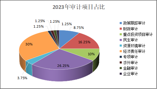 2023年,我局制定了《咸宁市2023年度统一组织审计项目计划》,安排全年审计项目80个,其中政策跟踪审计7个,财政审计13个,重点投资项目审计8个,民生审计21个,企业审计1个,金融审计1个,专项审计1个,涉外审计1个,资源环境审计3个,经济责任审计24个。全年审计项目计划执行情况如下: